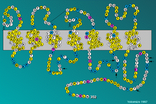 Hydrophobic (yellow), acidic (pink), and basic (blue) amino acids are colored. Two possible N-glycosilation sites (trees) and possible PKC phosphorylation sites (arrows) are indicated.