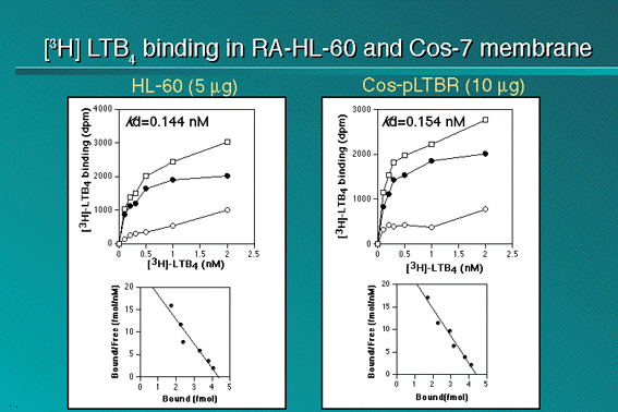 Binding isotherms and Scatchard analyses of [3H]-LTB4 binding to the membrane fractions of RA-treated HL-60 cells (5 micro g, left) and pLTBR-transfected Cos-7 cells (10 micro g, right) (n = 4).