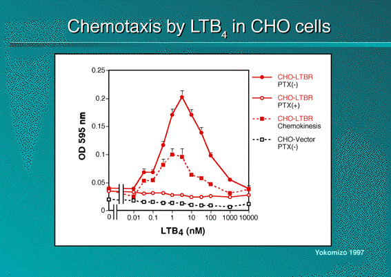 LTB4-induced chemotaxis (filled circles, red) and chemokinesis (filled boxes,